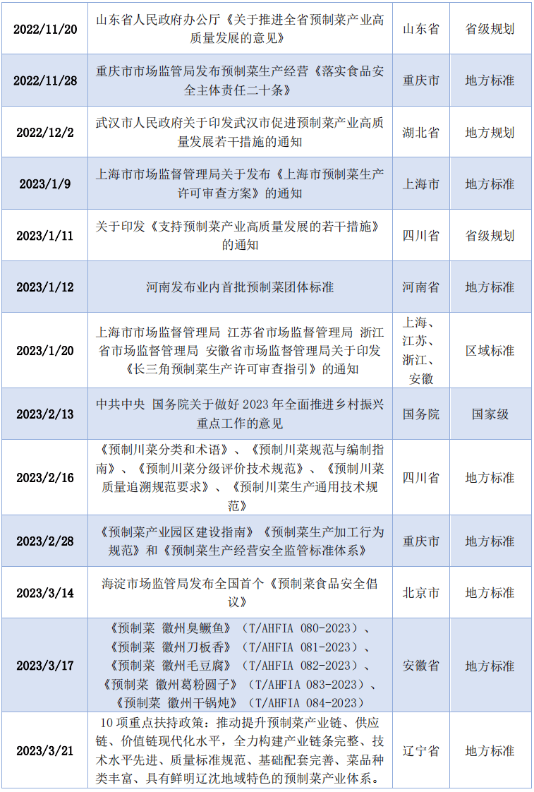 除了政策办法,从地方四处所,预制菜财产相关的尺度规范也连续出台。2022年6月,中国饭馆协会发布《预制菜质量分级及评价》和《预制菜出产质量办理手艺规范》集体尺度,为预制菜的尺度化出产供给了支持;2022年5月,江苏省餐饮办事尺度化手艺委员会、江苏省餐饮协会牵头发布《预制菜点质量评价规范》集体尺度;2022年11月,市场监管局发布预制菜出产运营《落实食物平安从体义务二十条》;2023年1月,上海市市场监视办理局关于发布《上海市预制菜出产许可审查方案》的通知等。