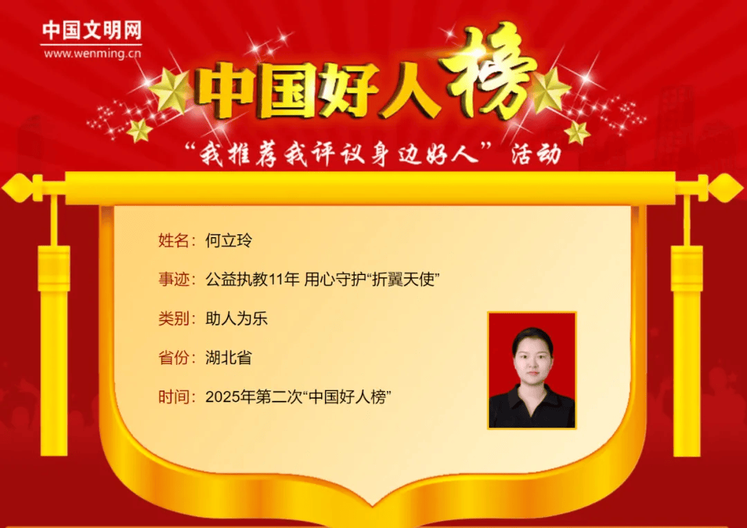 何立玲,女,1991年9月生,中员,湖北省襄阳市保康县城关镇个别运营户。自2014年起,她做为意愿者,到保康县特讲授校担任教师工做,每周四到学校上半天班,承担培智班的言语锻炼、唱逛取律动等课程讲授,11年如一日从未间断,不图任何报答。何立玲自备零食、玩具等激发学生进修热情,并吸纳2名特校优良结业生就业。何立玲曾获“湖北”等荣誉。